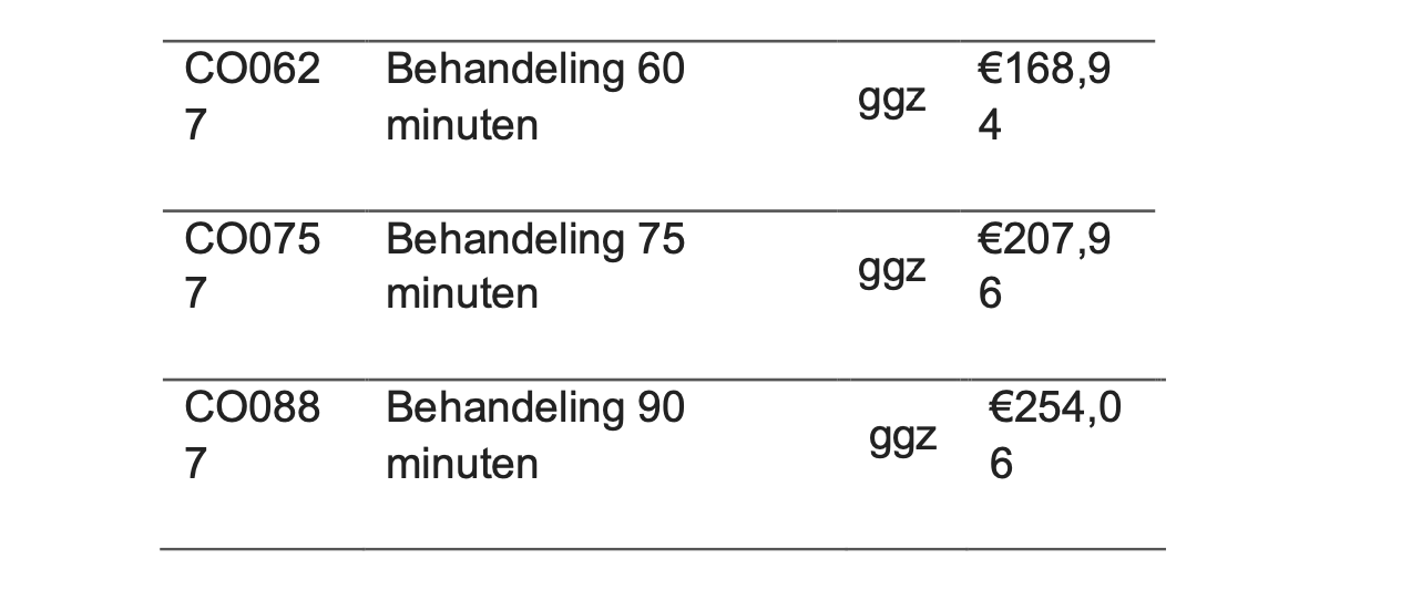 De tarieven volgens de Nederlandse Zorgautoriteit (NZA) voor 2025 zijn onderaan de pagina weergegeven.